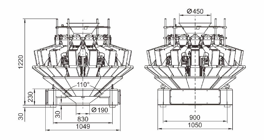 3. Наклонный внутрь весовой бункер заранее сокращает высоту падения.
